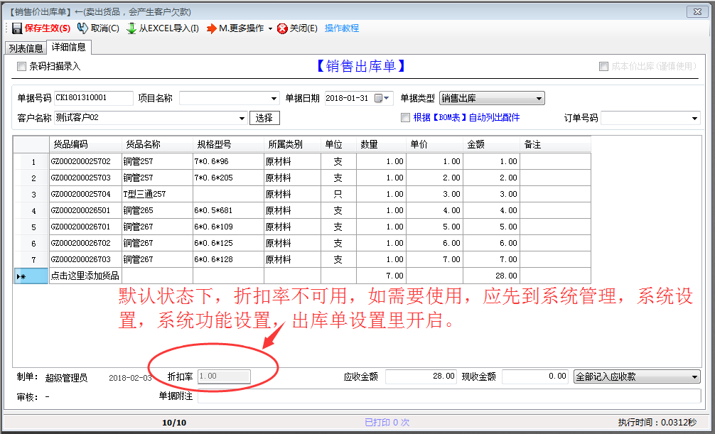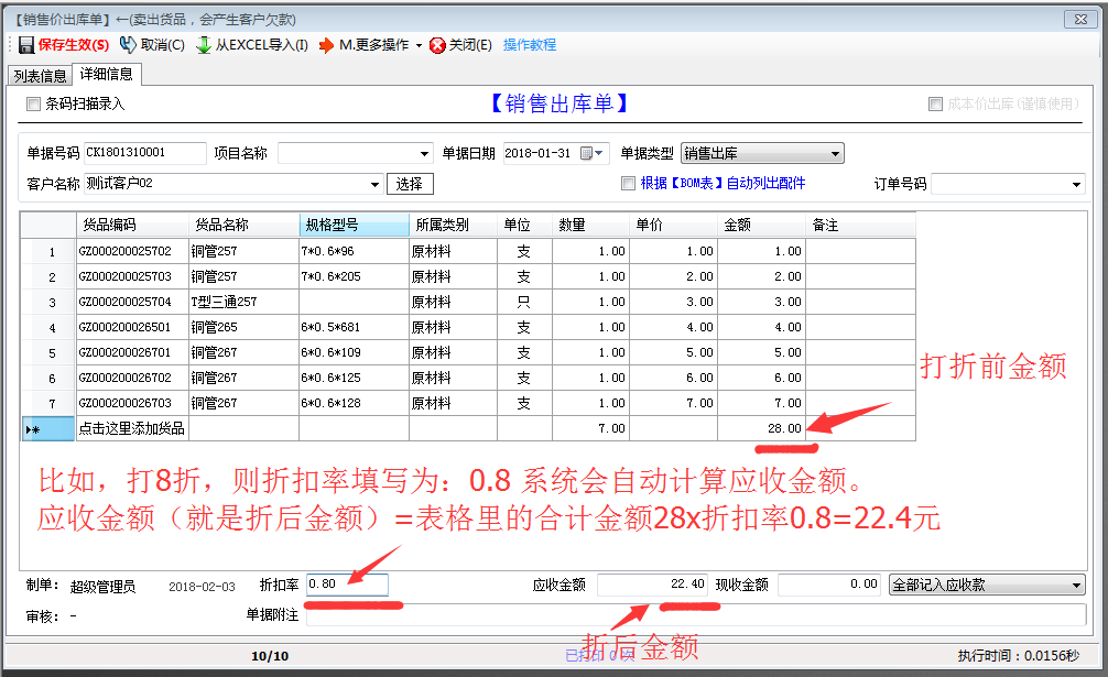 我們現(xiàn)在來(lái)做一張銷售出庫(kù)單,單據(jù)金額合計(jì)為28元,現(xiàn)在把折扣率修改為0.8 表示打8折,然后應(yīng)收金額就會(huì)自動(dòng)變成22.40元。這里的28元表示原價(jià)。0.8表示折扣率,22.40元表示折后金額。