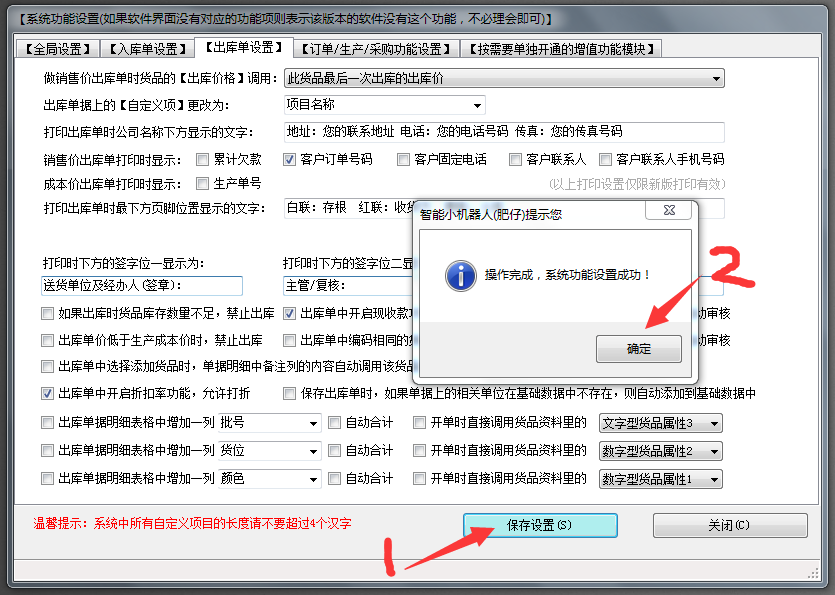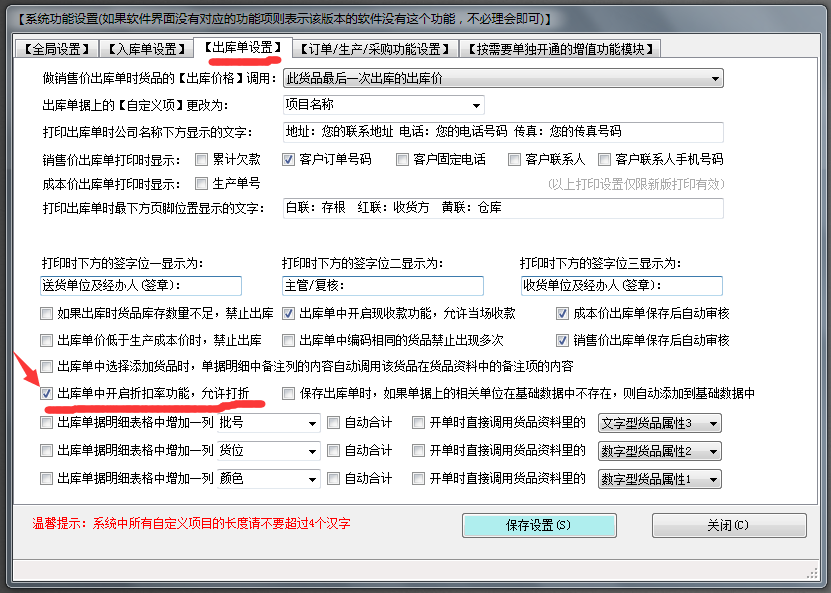 把【出庫(kù)單中開(kāi)啟折扣率功能,允許打折】前面的勾,勾上。然后點(diǎn)擊【保存設(shè)置】就表示開(kāi)啟這個(gè)功能了。
