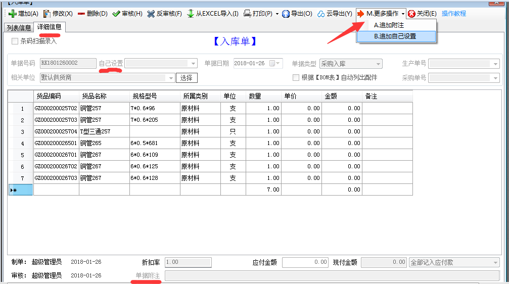 在單據(jù)的詳細信息界面(就是有貨品信息表格的這個界面)上,最上面有個【更多操作】里面有兩項?!咀芳痈阶ⅰ亢汀咀芳幼约涸O(shè)置】(如果用戶有改過自己設(shè)置項目名稱,那么這里的顯示會稍有不同,但是操作方法都是一模一樣的)