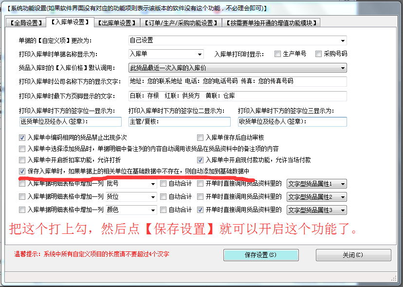 依次進(jìn)入【系統(tǒng)管理,系統(tǒng)設(shè)置,系統(tǒng)功能設(shè)置,入庫單設(shè)置】把【保存入庫單時,如果單據(jù)上的相關(guān)單位在基礎(chǔ)數(shù)據(jù)中不存在,則自動添加到基礎(chǔ)數(shù)據(jù)中】前面打上勾,然后點擊【保存設(shè)置】就可以開啟這個功能了。