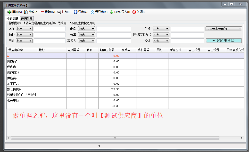 我們先看一下【基礎(chǔ)數(shù)據(jù),供應(yīng)商管理】里面,這里現(xiàn)在是沒有一個叫【測試供應(yīng)商】的相關(guān)單位的。
