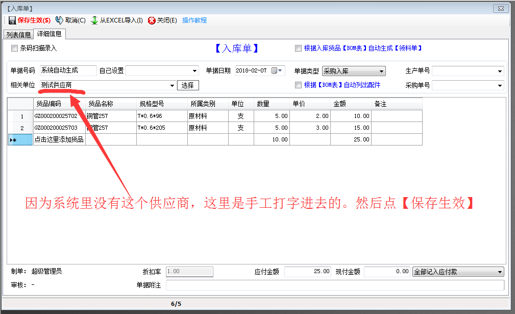 接下來我們?nèi)ルS便做一張入庫單,然后在相關(guān)單位這一欄手工錄入【測試供應(yīng)商】這個名字。然后點上面的【保存生效】按鈕 。