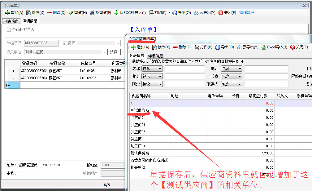 單據(jù)在保存了之后,我們再打開【基礎(chǔ)數(shù)據(jù),供應(yīng)商管理】里面,可以看到,這里已經(jīng)自動幫我們添加了一個叫【測試供應(yīng)商】的相關(guān)單位了。
